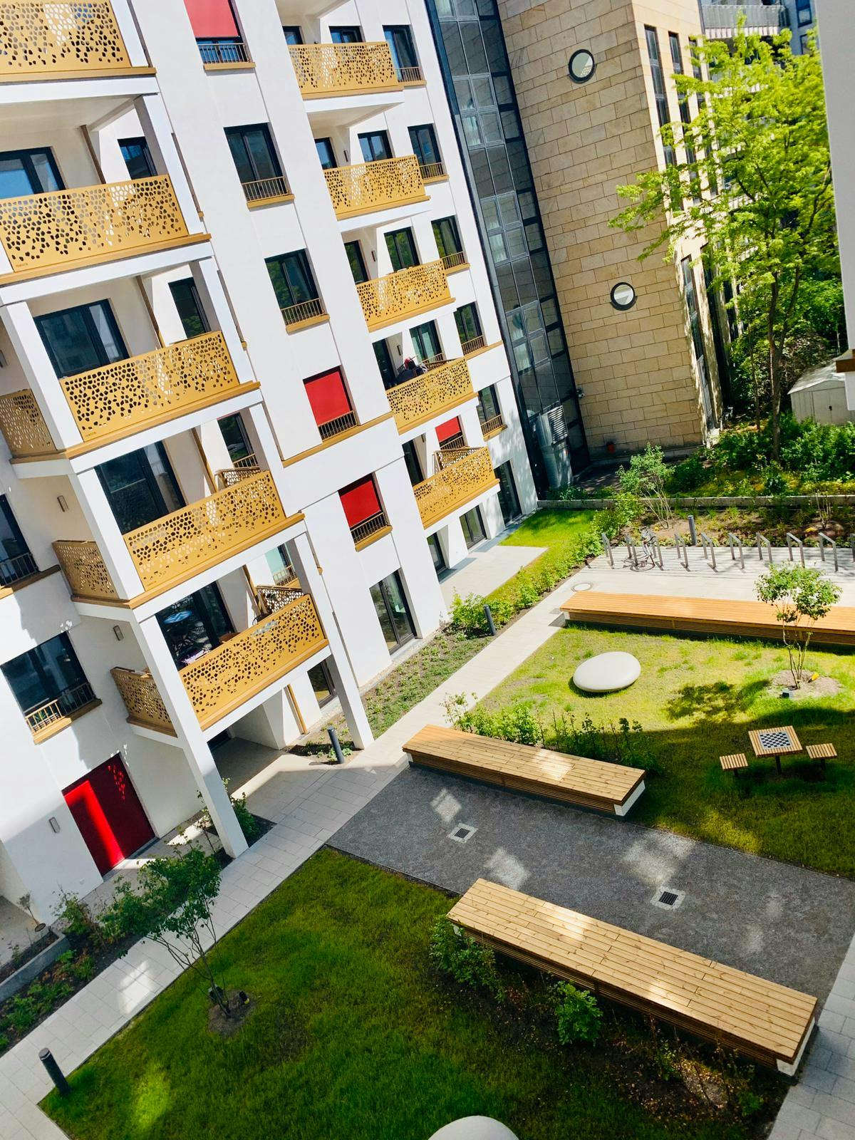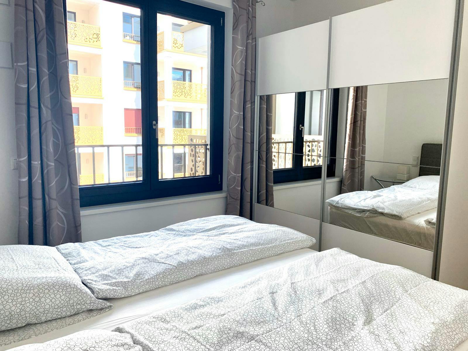 The new building with inner patio lies in Berlin-Mitte between Spittelmarkt and the Markisches Museum. 100 meters walk to U-Bahn station, line U2. Apartments have floor-to-ceiling windows and balconies. Living rooms are designed with real wood parquet, large-format porcelain stoneware tiles were used for the bathroom floors. World-class brands of fittings can be found in the bathroom equipment as well as towel radiators and underfloor heating.
