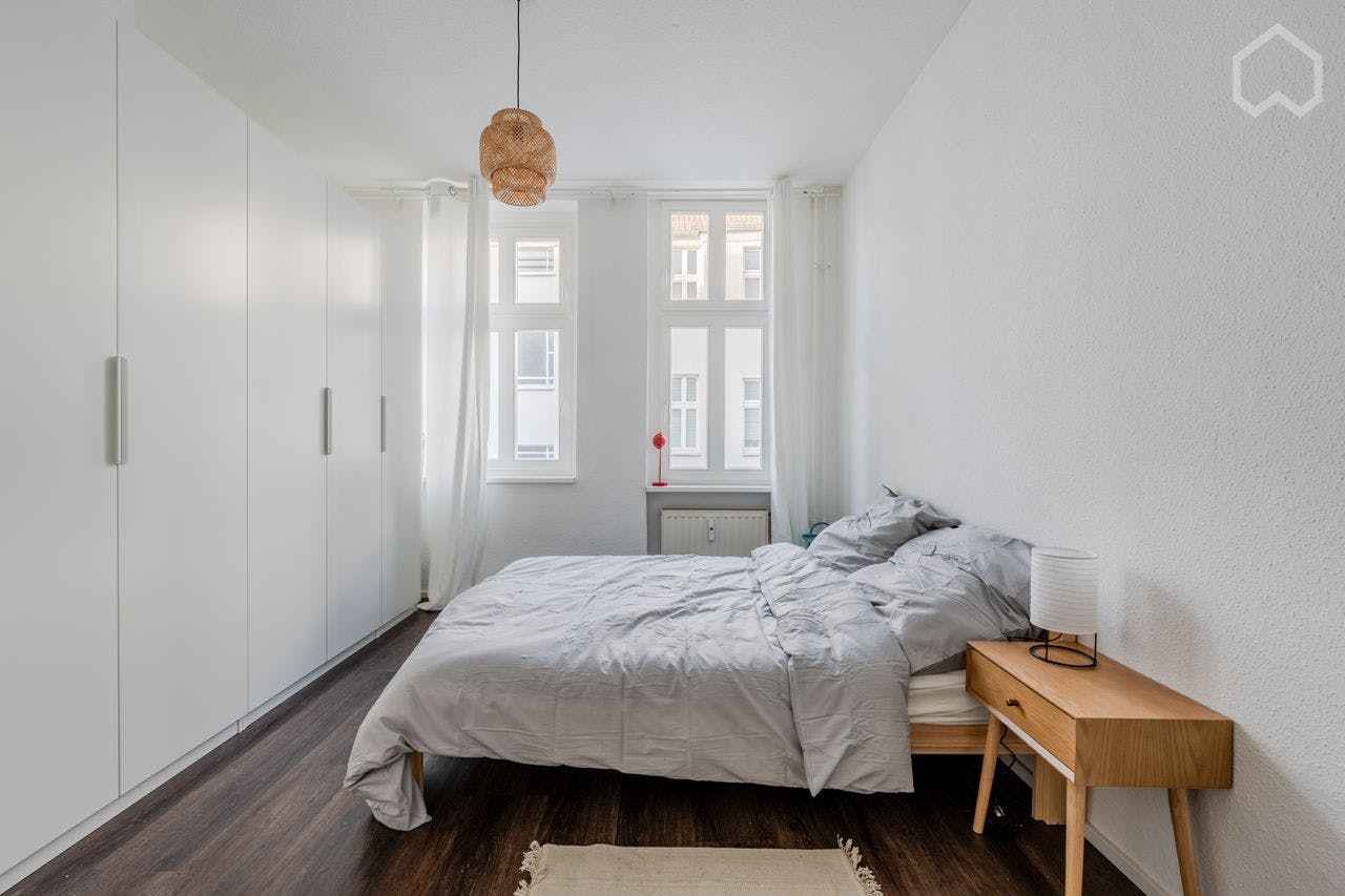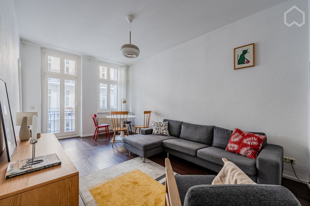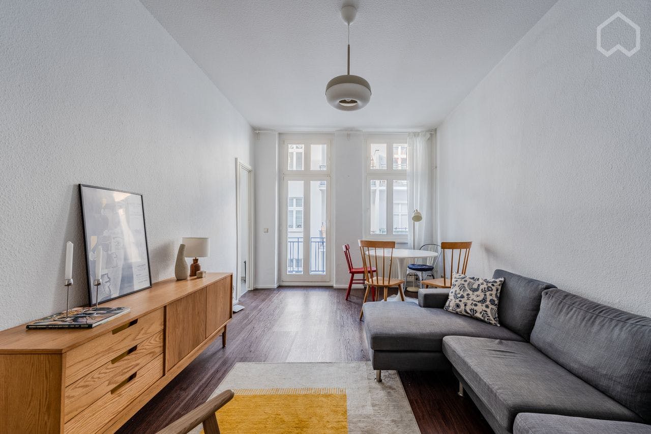 Stylish, modern furnished 2-room apartment (52 sqm) with a sunny balcony and bathtub, located on the 3rd floor in trendy Prenzlauer Berg. The flat is in the backyard and all neighbors are respectful. The flat has a well-designed layout with lots of natural light, fully equipped with dishwasher and washing machine. It's a typical Berlin Altbau building with vintage charm and thanks to modernization, the flat is well insulated and therefore warm and quiet. The flat has an excellent location close to the Ringbahn. The closest stations including S/U Schönhauser Allee, S Gesundbrunnen and S Bornholmer Str., which makes traveling very convenient and...