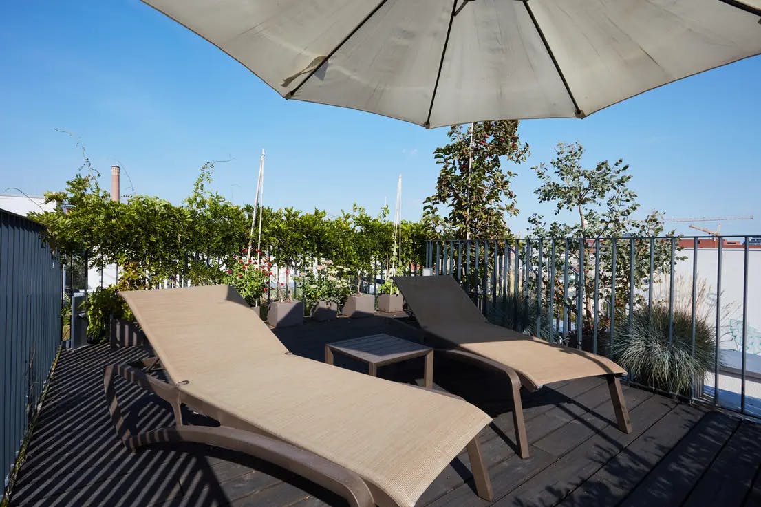 Spectacular penthouse apartment in a modern 2016 building in the heart of Mitte. Bright, stylish, and fully furnished, it features 2 bedrooms with Smart TV, and electric blinds for added comfort and privacy. Floor-to-ceiling windows create a calm, light-filled atmosphere, making it ideal as a main living and sleeping space. The penthouse itself is located in the front building and is easily accessible via elevator. Residents enjoy a spacious living and dining area with large windows opening onto a sunny south-facing terrace, as well as an additional rooftop terrace. The master bathroom includes both a walk-in shower and a bathtub, complemented...