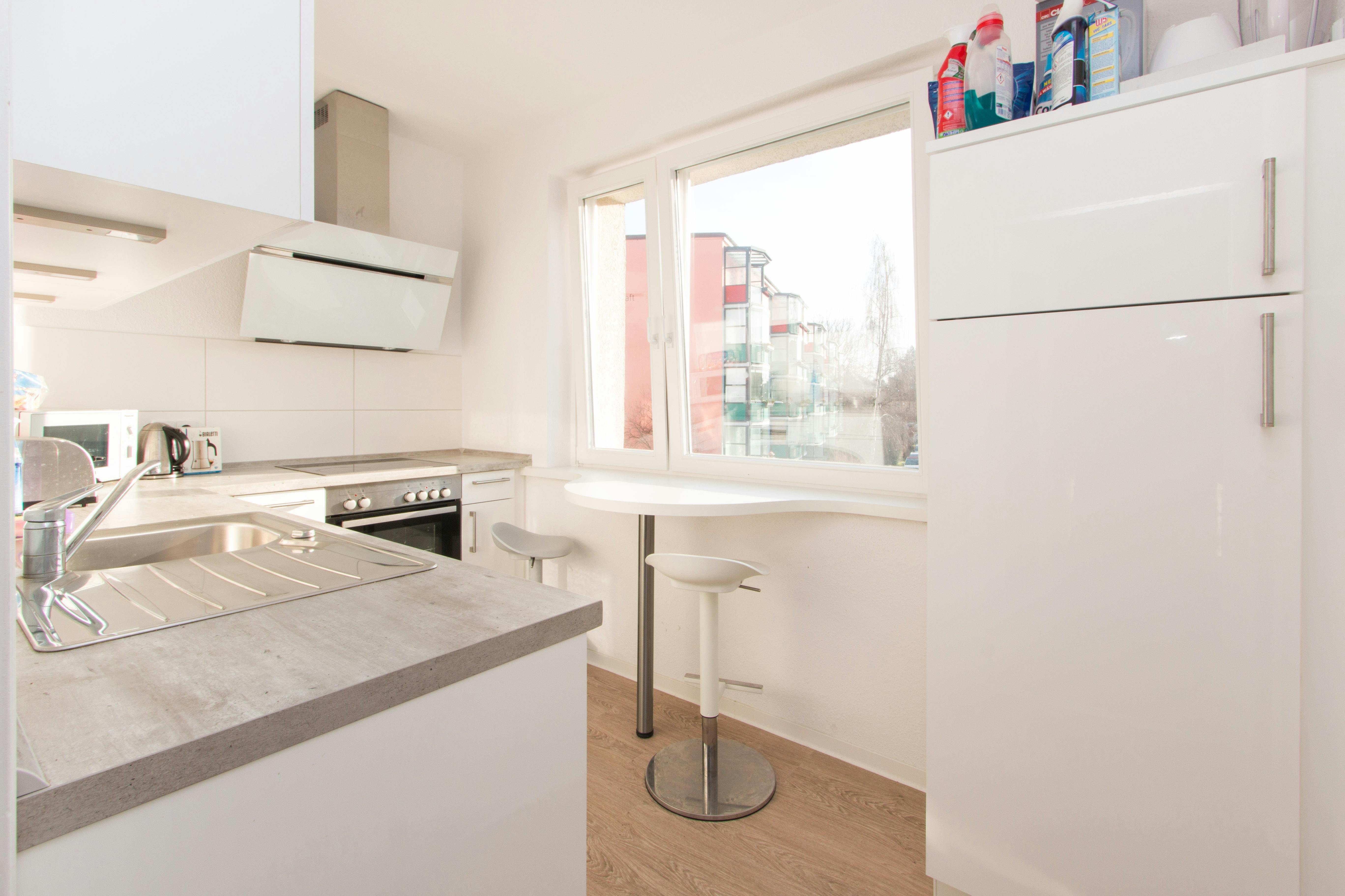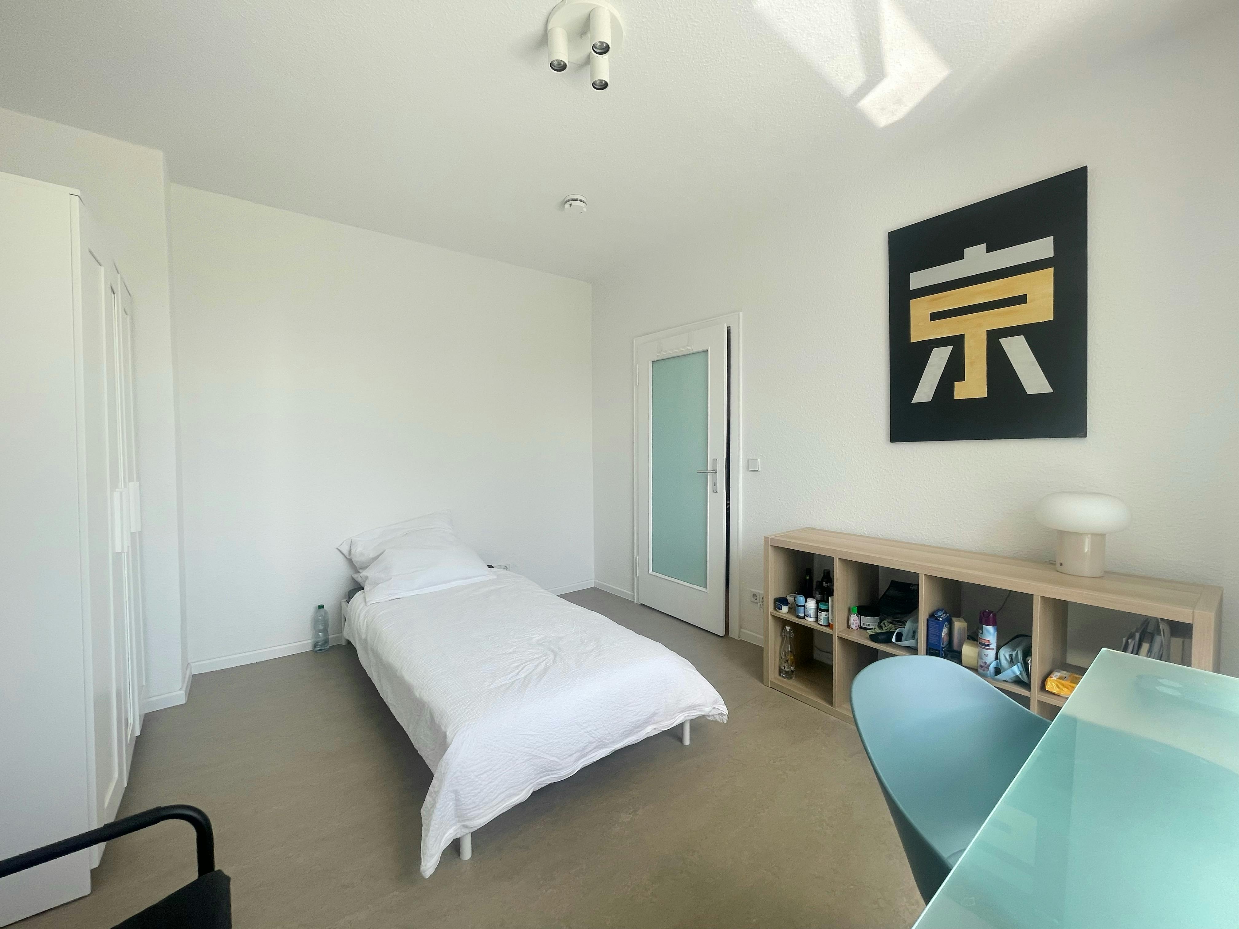 In a room located on 2nd floor of the building. We created a student-friendly living space by selecting materials that transform the apartment into peaceful environment with bright colors: a “feel good” vibe. The apartment has a brand new white lacquered kitchen, and all you need to cook both gastronomic and on-the-go meals. It has Limoges dishes, fine glasses, good cutlery and sharp cooking knives. Each room offers a single bed and (a) roomy closet(s). Laundry is a snap with an all-in-one washer-dryer. Getting downtown is easy with many public transport connections, and the apartment is only a ten- minute walk...