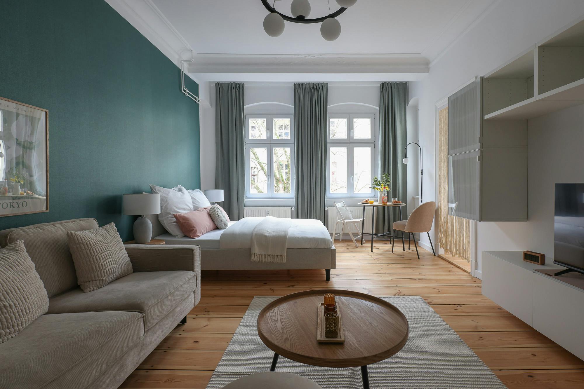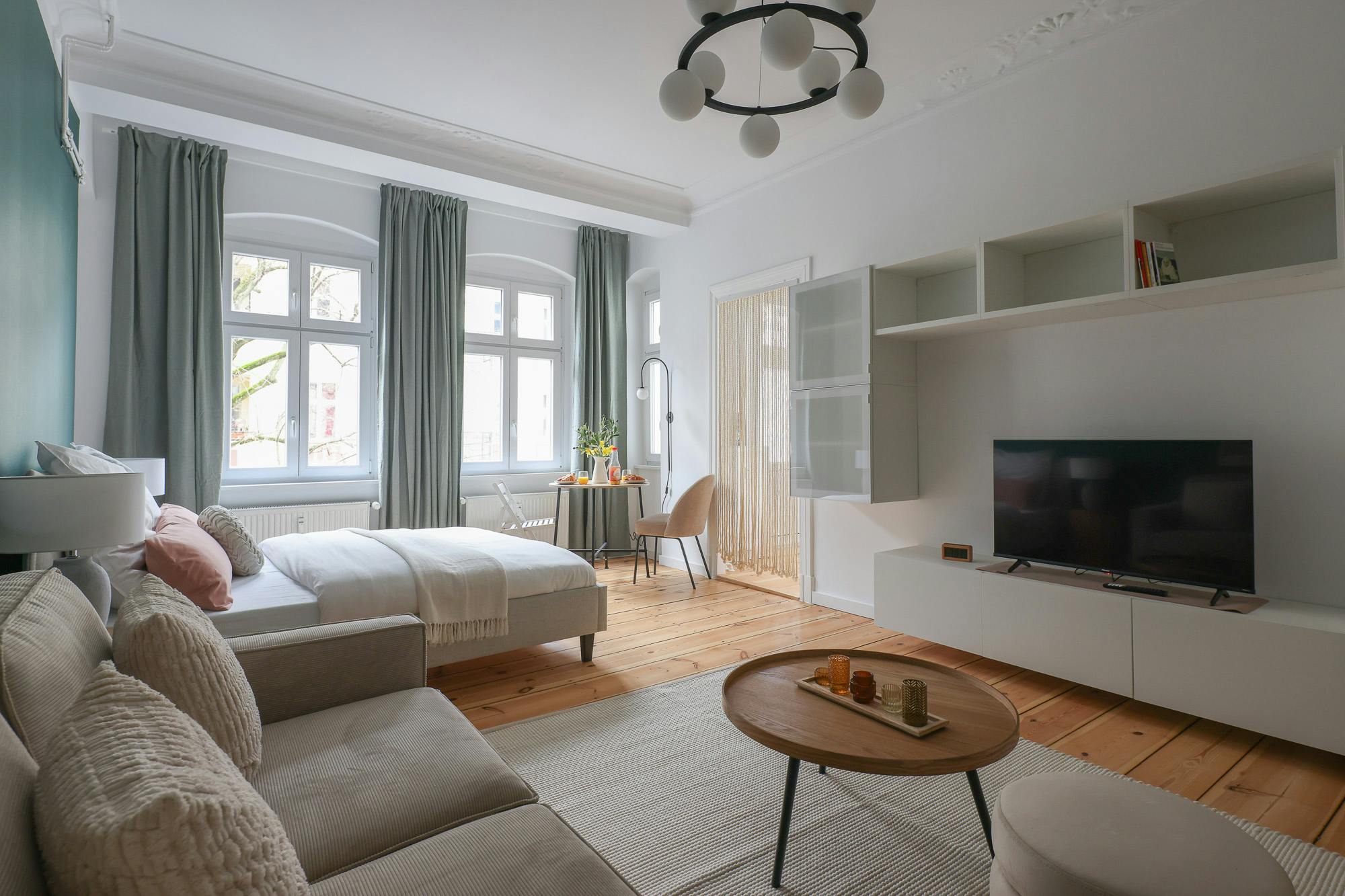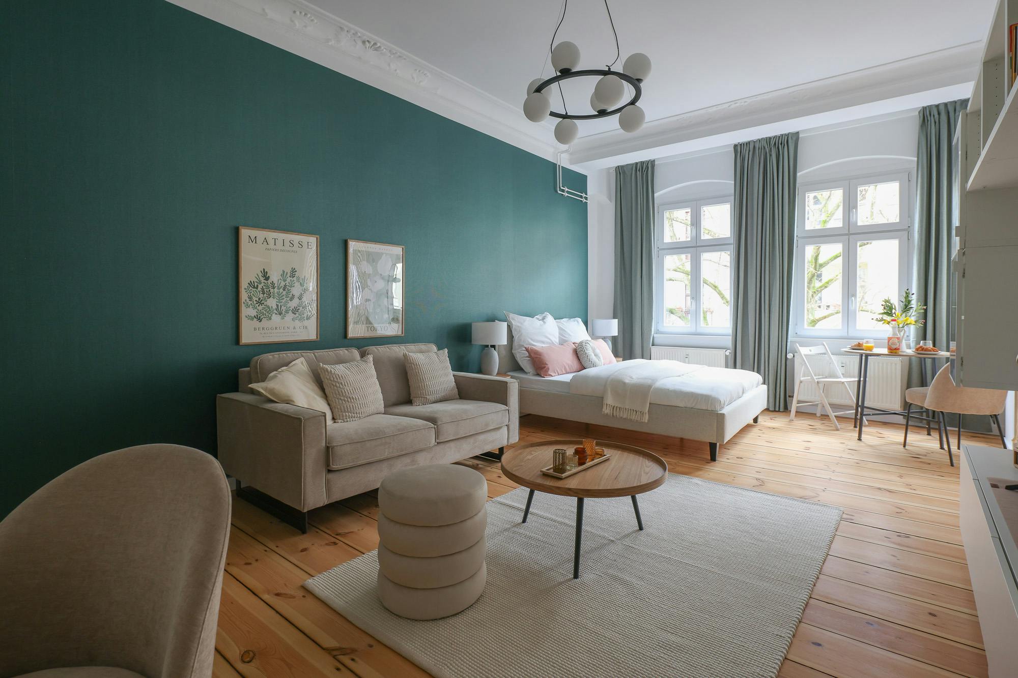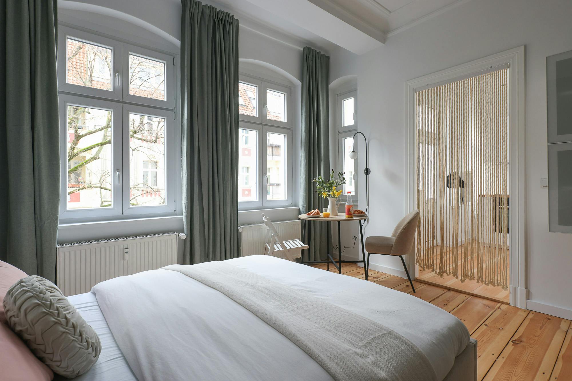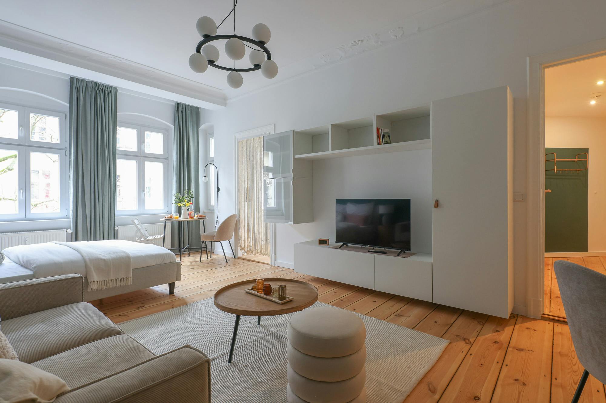 HOUSE This beautiful one bedroom apartment is located on the 3rd floor of a typical Berlin Altbau. APARTMENT You enter this beautiful apartment into a hallway that connects to the bedroom and the bathroom. The kitchen is fully equipped with all necessary utensils that you might need to cook a delicious meal. In the living room there is a dining table that fits two people. You will also find a comfortable sofa and a smart TV in this open living room. There is a cozy queen-sized bed (160×200) and with the wardrobe and the chest of drawers there is enough storage room to...