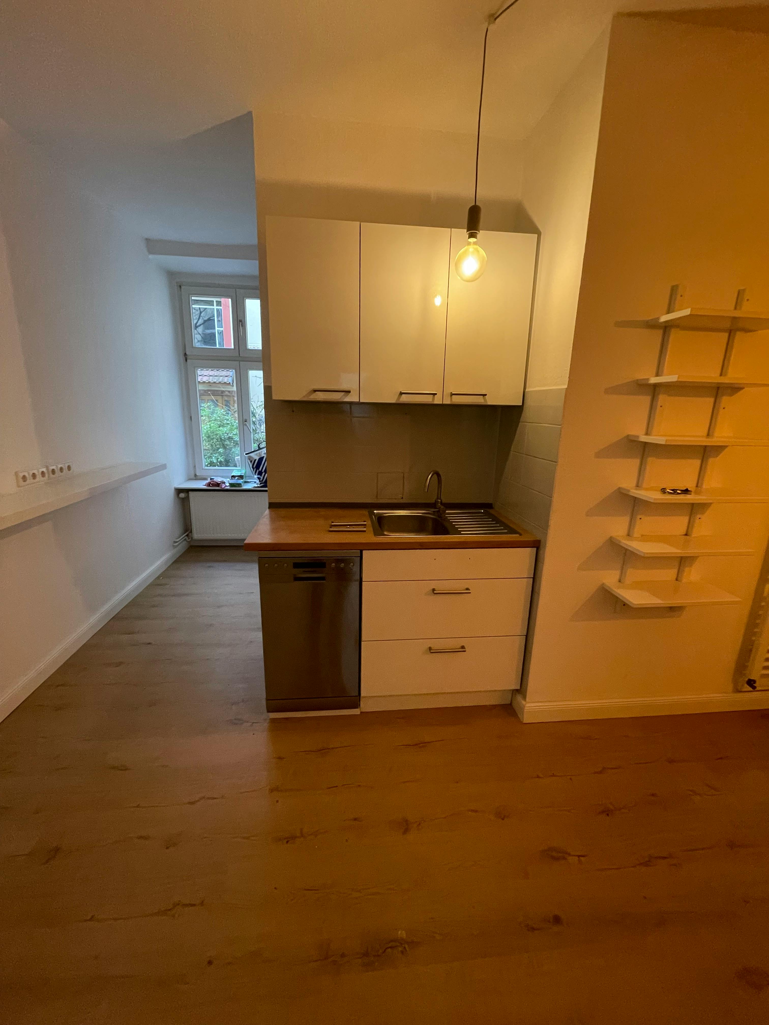 2 Zimmer mit eigenem Bad und eigenem Eingang - wie eine eigene Wohnung, aber in einer WG mit grosser Gemeinschaftsküche in komplett sanierter 4 Zimmer WG Wohnung im Hinterhaus Parterre eines schönen Gründerzeit Altbaus. Kleines Schlafzimmer nach hinten zum schön gestaltetem 2. Hinterhof, möbliert mit 1.40 x 2.00m Bett, neues Laminat in Pinienoptik, ein weiteres grosses Wohnzimmer zum schönen Innenhof mit grossen Fenstern und alten Dielen. Komplette Einrichtung mit grossem Sofa, Schreibtisch, und Schrank . Neue grosse Gemeinschaftsküche, komplett ausgestattet. Fantastische Lage im Herzen des Ausgehviertel Friedrichshain, das coolste Viertel mit den coolsten Bars, Restaurants, Clubs...