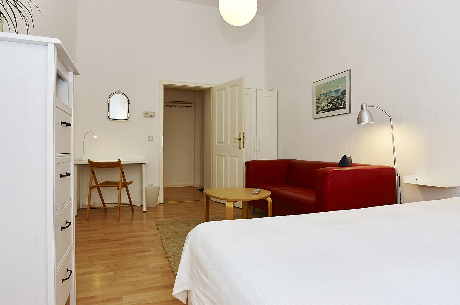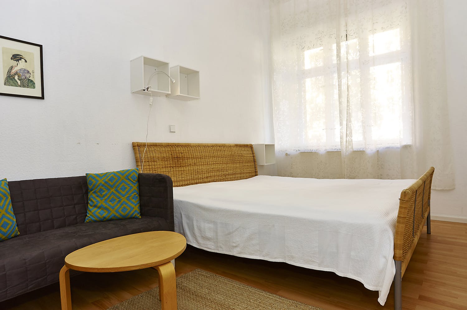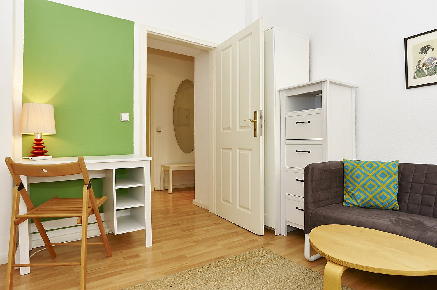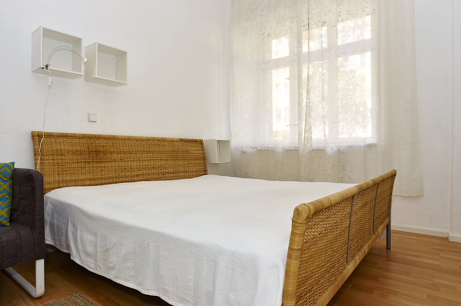 2 Rooms • 58 sqm • Ground floor • Terrasse • Friedrichshain • Bänschstrasse Minimum stay: 8 months • Maximum stay: 12 months • Anmeldung is provided Suitable for: Roommates / 1 - 2 People Details Room 1 Double bed 160X200 Wardrobe Chest of drawers Sofa bed 140x200 Coffee table Carpet Desk Chair Curtains Electric shutters Room 2 Double bed 180X200 Wardrobe Chest of drawers Sofa Coffee table Carpet Desk Chair Curtains Electric shutters Kitchen Fridge Oven Cooking plate Microwave Dining table Chairs Dish drying rack Electric shutter Bathroom Washing machine Shower Bathtub Shelf Towel rack Mirror Hall Mirror Hangers Bank Storage room Shelves Amenities WiFi Laminat floor Gas heating Clothes hangers Vacuum cleaner Plates/glasses/cutlery Pots and pans Cooking equipment Public transport 4 minutes walk to Tram Proskauer Straße station (M10/21) 7 minute walk to U-bahn Samariterstraße station (U5) 7 minute walk to U-bahn Storkower Straße station (S2/S8/S41/S42/S85) Supermarkets 5 minutes walk to REWE 5 minutes walk to LIDL 6 minutes walk to Netto...