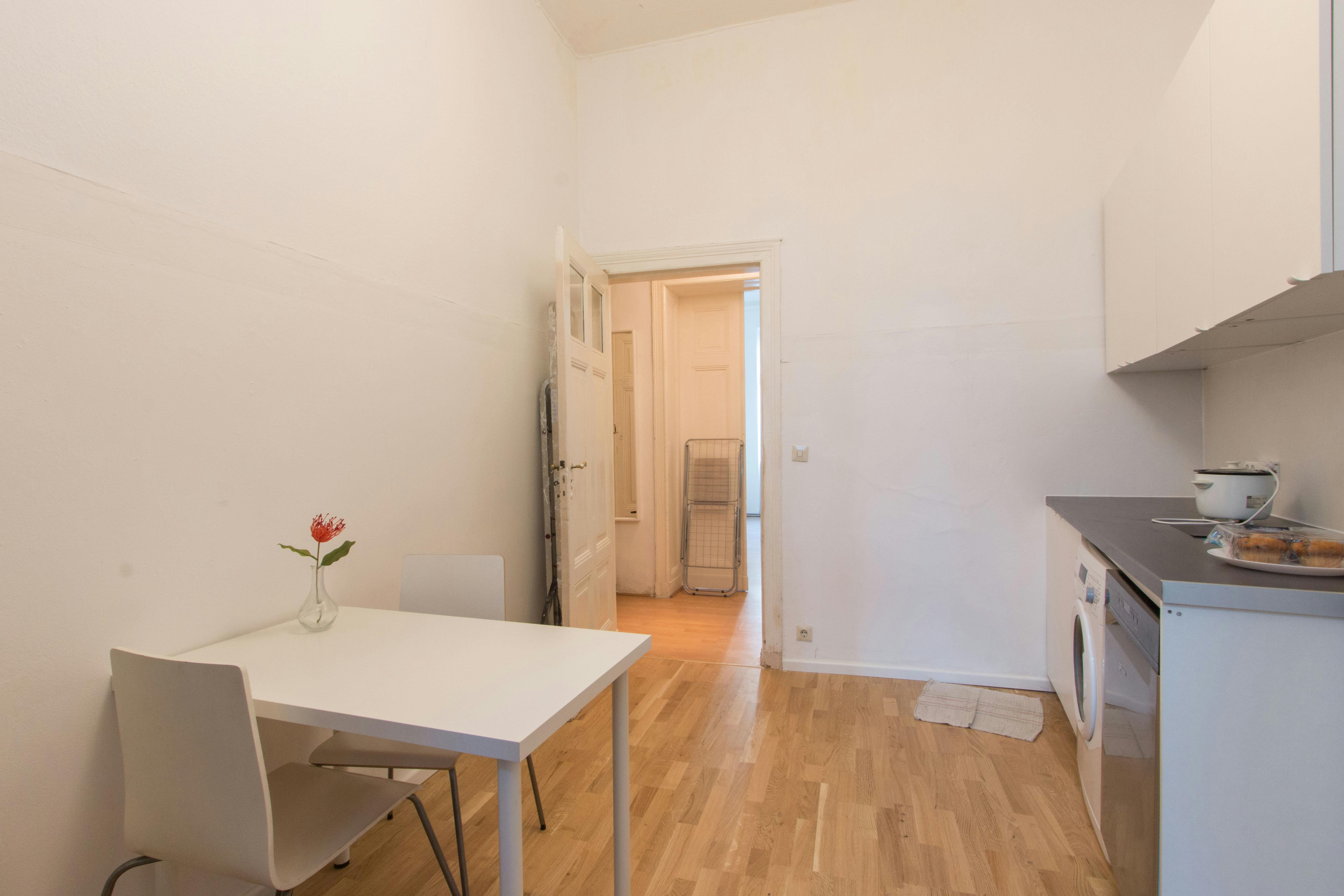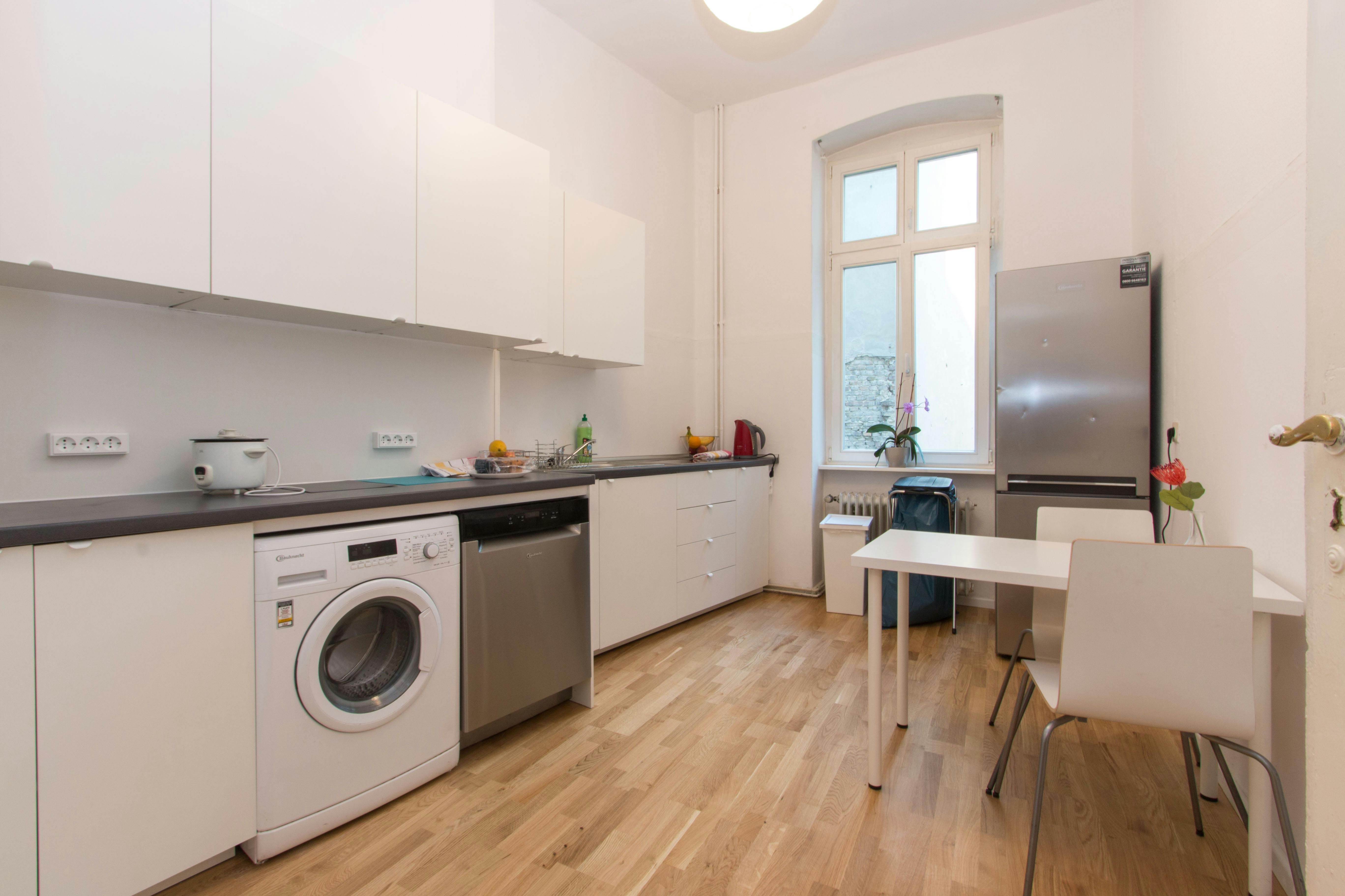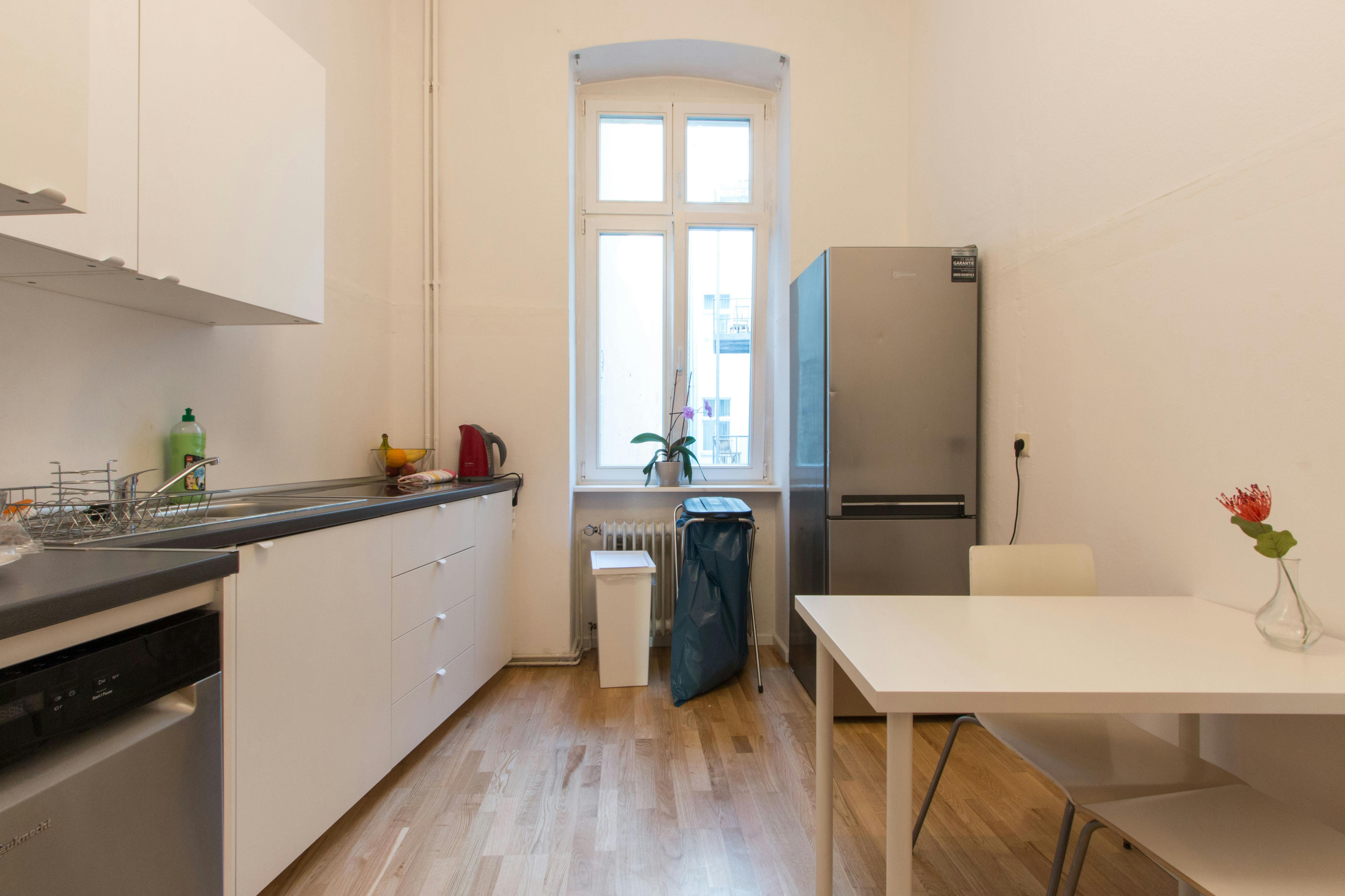 Room description Bedroom 1, is a bed for rent, nearest to the door, in a shared-occupancy room with 3 beds. It also has a desk, storage space and a window with a view of the street outside. Please note that you will share this room with 2 other persons. Description This modern apartment in Berlin has 2 furnished rooms and 1 shared bathroom and kitchen to rent. The beds can be rented individually or rooms can be rented as a whole. All of the rooms are spacious and bright, and are furnished with standalone wardrobes for your belongings. The tidy kitchen is...